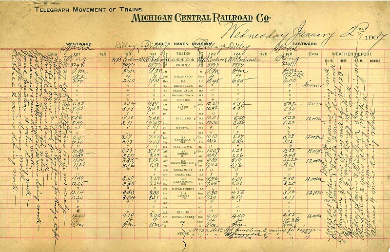 One of the group members obtained registers of train movements for most of the month of January 1907. I believe they are in the public domain due to age. January 2 is pictured below, the individual files are Adobe PDF's.